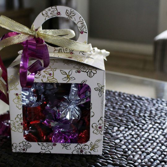 A gift box of assorted home-made chocolates,containing about 5-6 varieties like dry fruits,paan,butterscotch etc.This gift box contains about 25 pieces of chocolates, each weighing about 10-15 grams .
